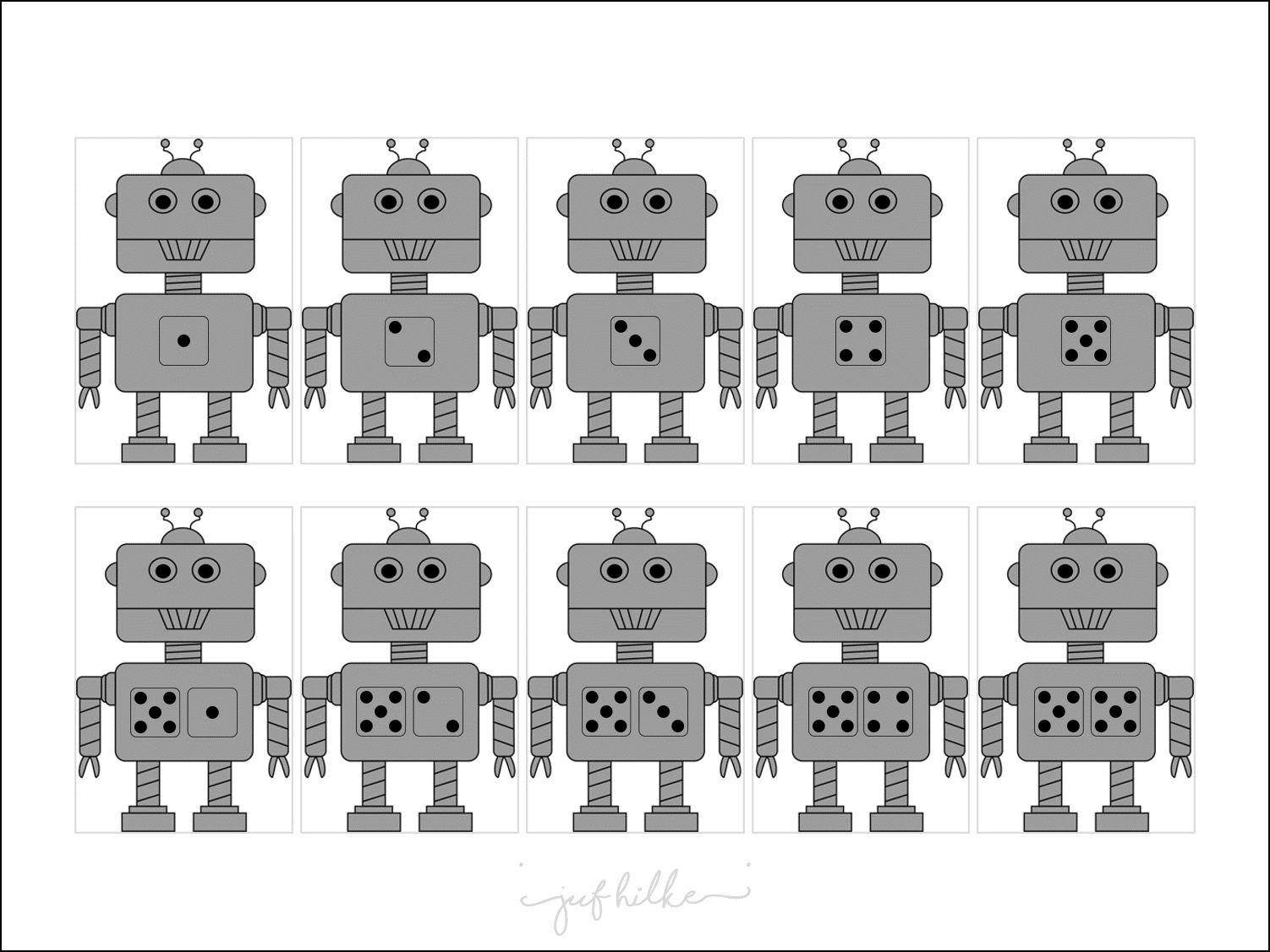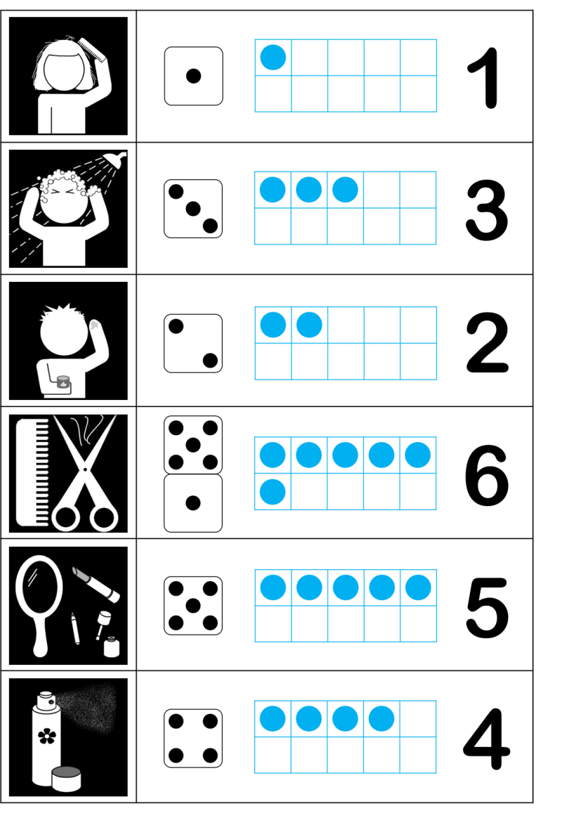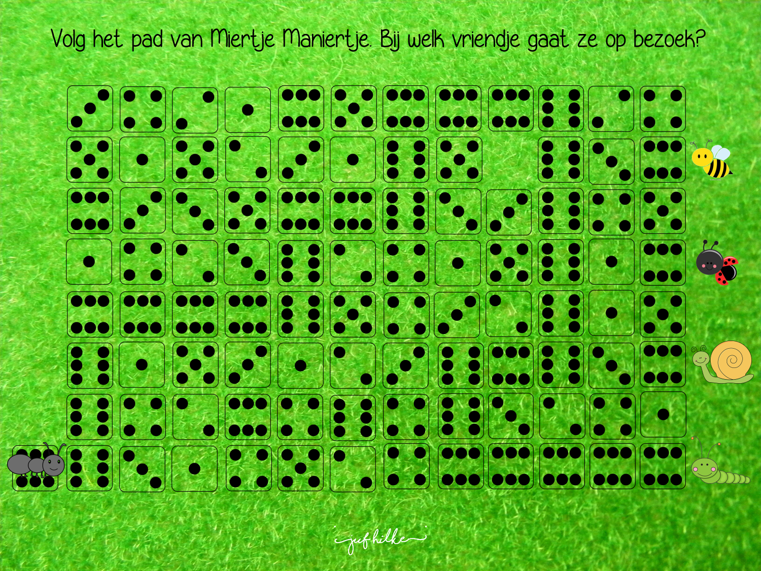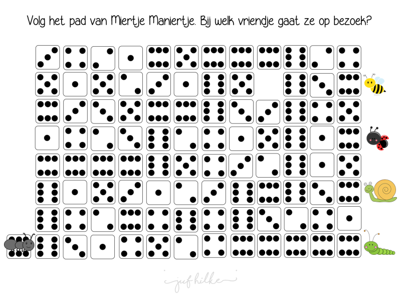 (Dobbelsteenbeeld van 6 wordt enkel gebruikt om de pootafdrukken van Miertje Maniertje voor te stellen, zodat kinderen inzien dat gestructureerde getalbeelden niet één voor één geteld moeten worden.)