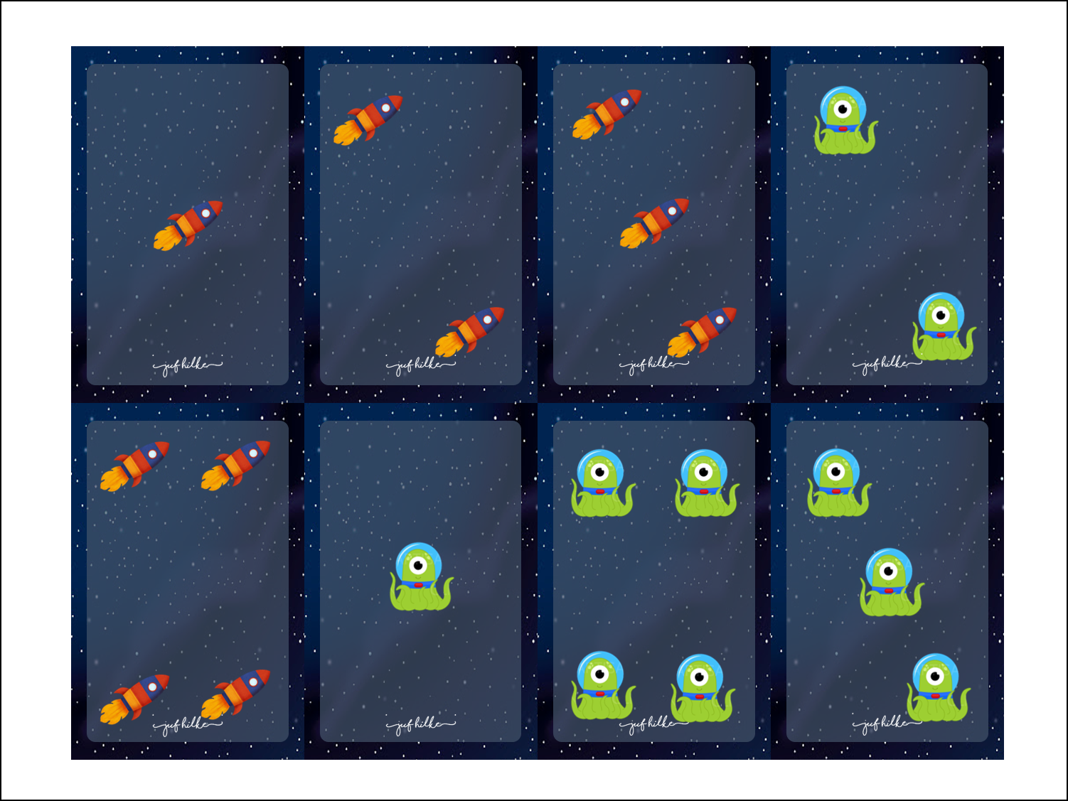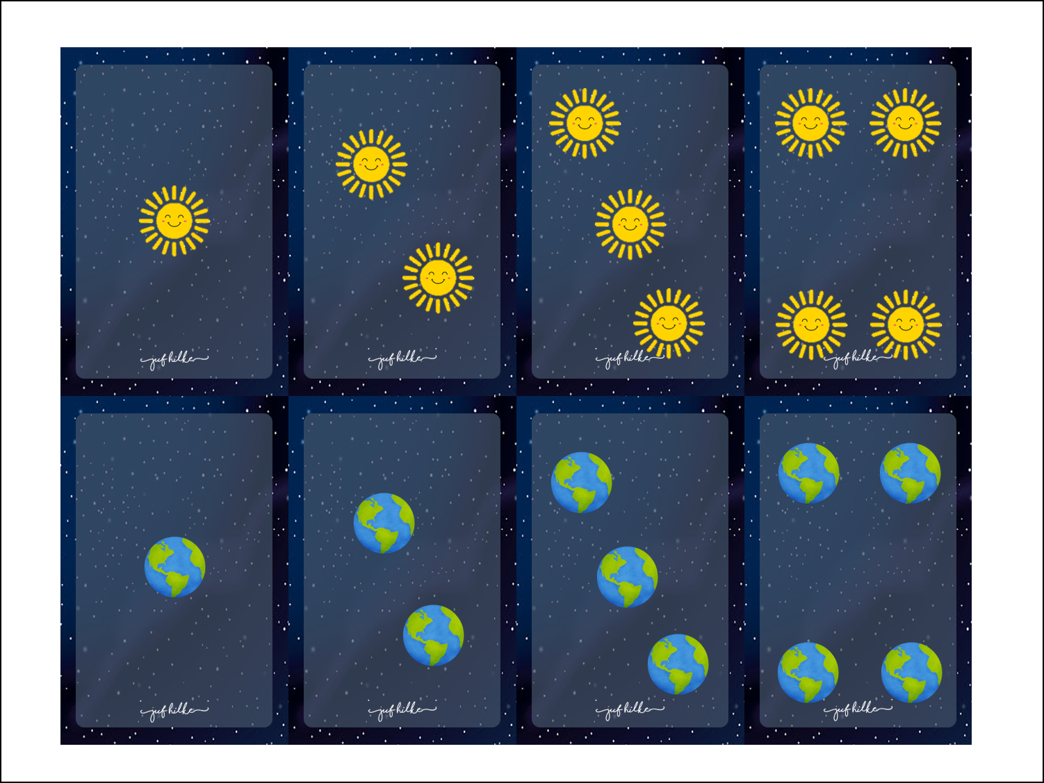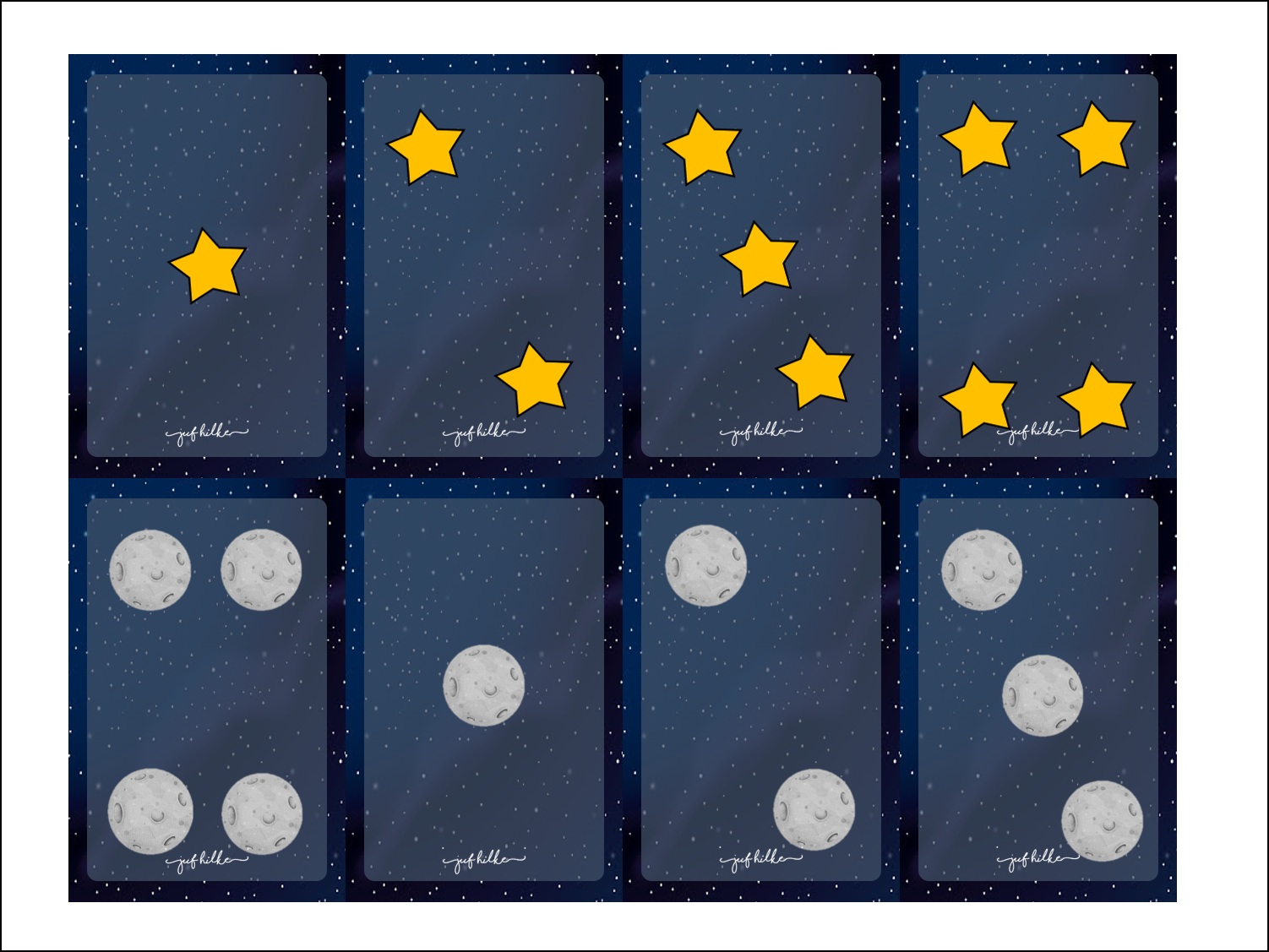 Deze prenten hingen overal op het schooldomein op. De kinderen kregen een aantal sterretjes op hun hand. Zo wisten ze welke blaadjes zij moesten doen. Ze deden al lopend een toertje over het schooldomein, bij elke prent die ze tegenkwamen met hun aantal sterretjes moesten ze het juiste antwoord roepen. Nadien gebruikten we deze prenten in een bewegingsomloop in de turnles.